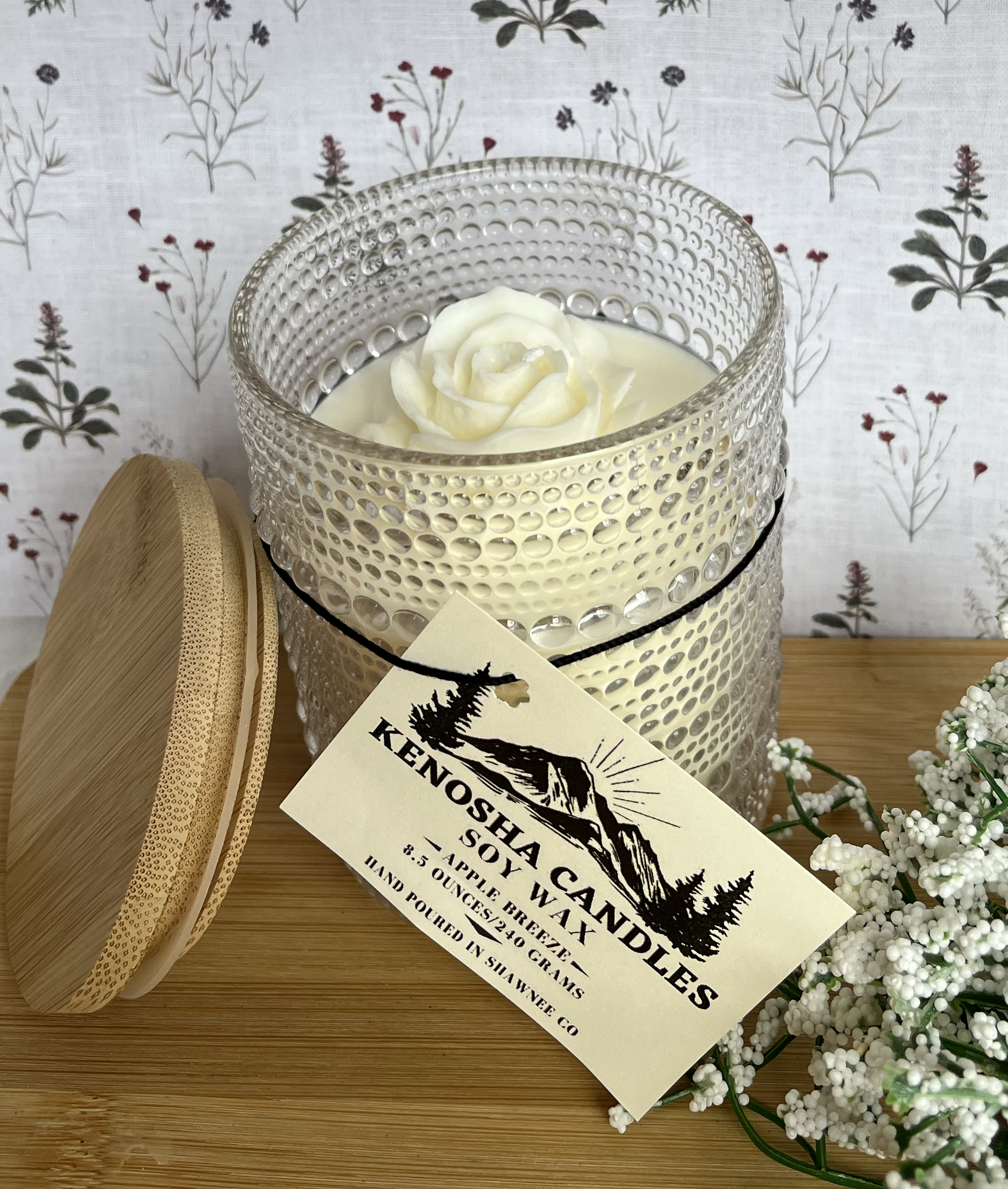 Elevate your space with this stunning candle, housed in a delicate glass jar adorned with hobnails and a charming rose encircling the cotton wick, Crafted from 100% natural soy grown in America's Midwest, this 8.5 oz (240g) candle is free from paraffin, beeswax, dyes and harmful phthalates offering a clean, long lasting burn of 60+ hours. Each candle is highly scented, filling your home with a captivating aroma from the first light to the last. Hand poured in Shawnee, Colorado.